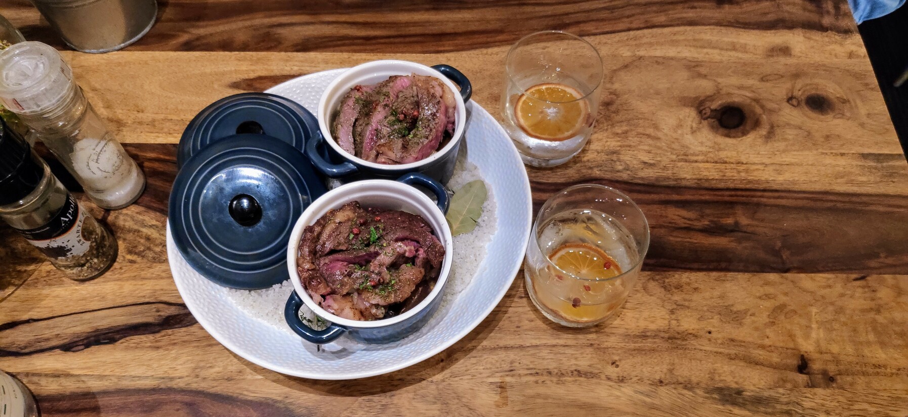 We kunnen je wel elke gang uitleggen, maar dat maakt het misschien wat minder spannend. Toch willen we je een klein inkijkje geven in de gerechten en de gins. Alles is gebaseerd op foodpairing. Bepaalde smaken van je gin-tonic komen weer terug in je gerecht. Zo dronken we een Slagersgin met Indian tonic. Daarbij kregen we rib-eye, truffelaardappeltjes en gekarameliseerde knolselderij. De vleeskruiden in de Slagersgin combineerden mooi met het vlees en het gerookte zout in het gerecht combineert met de gerookte sinaasappel in de gin. Het vetje van de grainfed rib-eye smelt op je tong. “Lekker hè?”, spreekt de jongen die ons bedient aan, “Dit is mijn favoriete gerecht.”