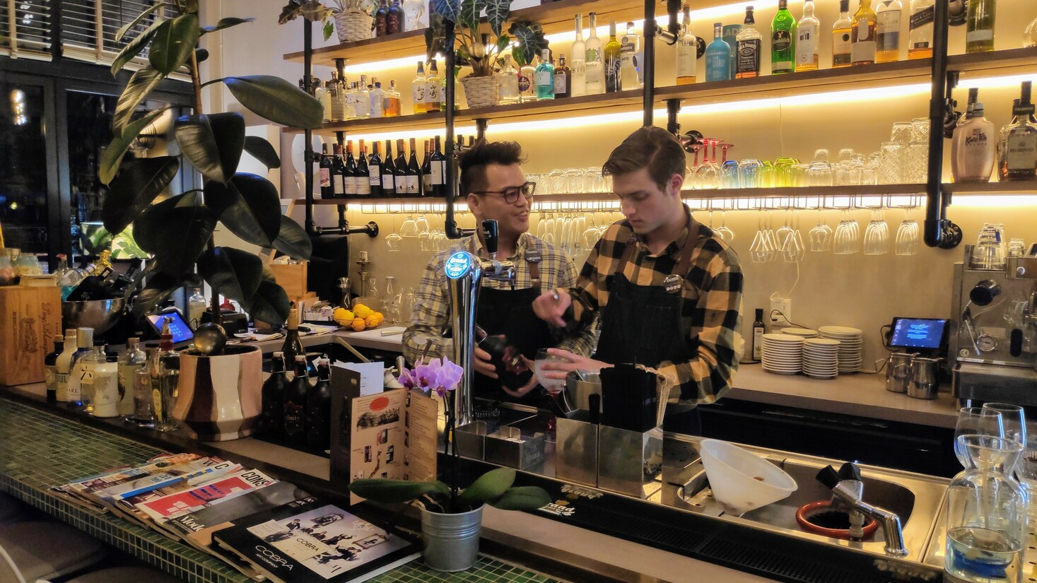 Eigenaar Steven Cheng probeert echt vernieuwing te scheppen met zijn gin-tonics. We krijgen bij de eerste gang al een gin-tonic met een pipetje honing. En ergens in die vijf gangen staat ook een ontzettend frisfruitige lichtblauwe gin-tonic op je te wachten. Natuurlijk gekleurd door zeewier, groenten en fruit. Bij Bomm nemen ze je op die manier mee op reis dwars door de wereld. Van Franse mosselen tot Australische runderen. Van Schiedamse gins tot Japanse biet. En het is allemaal top. De gerechten zijn afwisselend, vullen precies genoeg, zien er mooi uit en smaken ook nog eens ontzettend goed.
