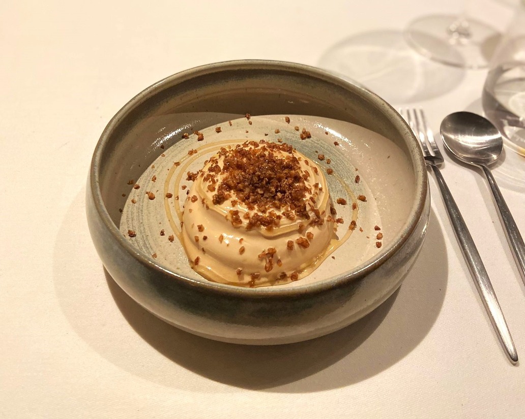 Wat nog volgt is eendenlever met een bouillon van lychee en sakura, rundersukade en twee desserts. Het dessert met Mont d'Or, nashipeer, rogge en kotikalja, een Scandinavische drank om ook Britta d'r roots te vertegenwoordigen, getuigt wederom van de creativiteit van Yuri. 'You either love it or hate it', als we de ondernemers moeten geloven. Het valt bij mij goed in de smaak, bij mijn tafelgenoot iets minder. Wel zijn we het erover eens dat we een dessert als deze nog nooit eerder op hebben. We sluiten af met een voor Yuri erg persoonlijk dessert, namelijk zijn interpretatie van de Indonesische drank cendol. Kokos met gula djawa, pandan en herkenbare groene druppels en waaiers. "Het doet me denken aan mijn oma, dus dit dessert moest terugkomen op het menu."