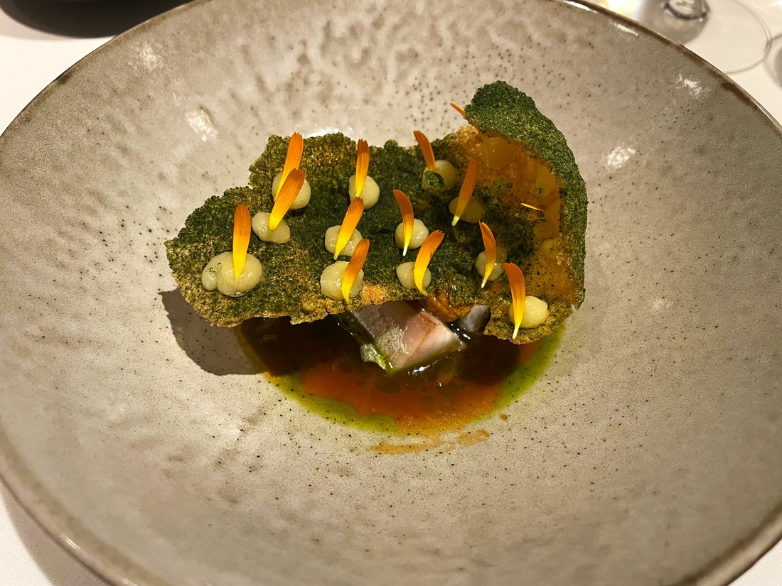 Het 7-gangen menu start met een kleurrijk gerecht, een prachtig contrast met de zaak, van langoustine met een pittige pipian verde, een groene Mexicaanse saus met pompoenpitten, tomatillo, pepers en kruiden. De langoustine wordt in zijn waarde gelaten en is alleen kort gegrild, waardoor de smaak van het schaaldier goed aanwezig is. In het gerecht zijn lichte citrustonen aanwezig en de huacatayblaadjes bovenop geven het geheel een klein bittertje. Daarop volgt daikon, linten met de hand gerold, met zeewier en zelfgemaakte kikkererwtenmiso en daarna makreel met aardappel en een boemboe waarin de roots van de half-Molukse Yuri goed terug te proeven zijn. Kruidig en met een beetje pit. Britta: "De boemboe van Yuri is eigenlijk wat pittiger, maar we hebben hem een beetje aangepast zodat hij iets toegankelijker is." Ook bij dit gerecht spat de kleur van het bord. Wat ons betreft Yuri zijn signature dish, al dan niet in verschillende variaties.