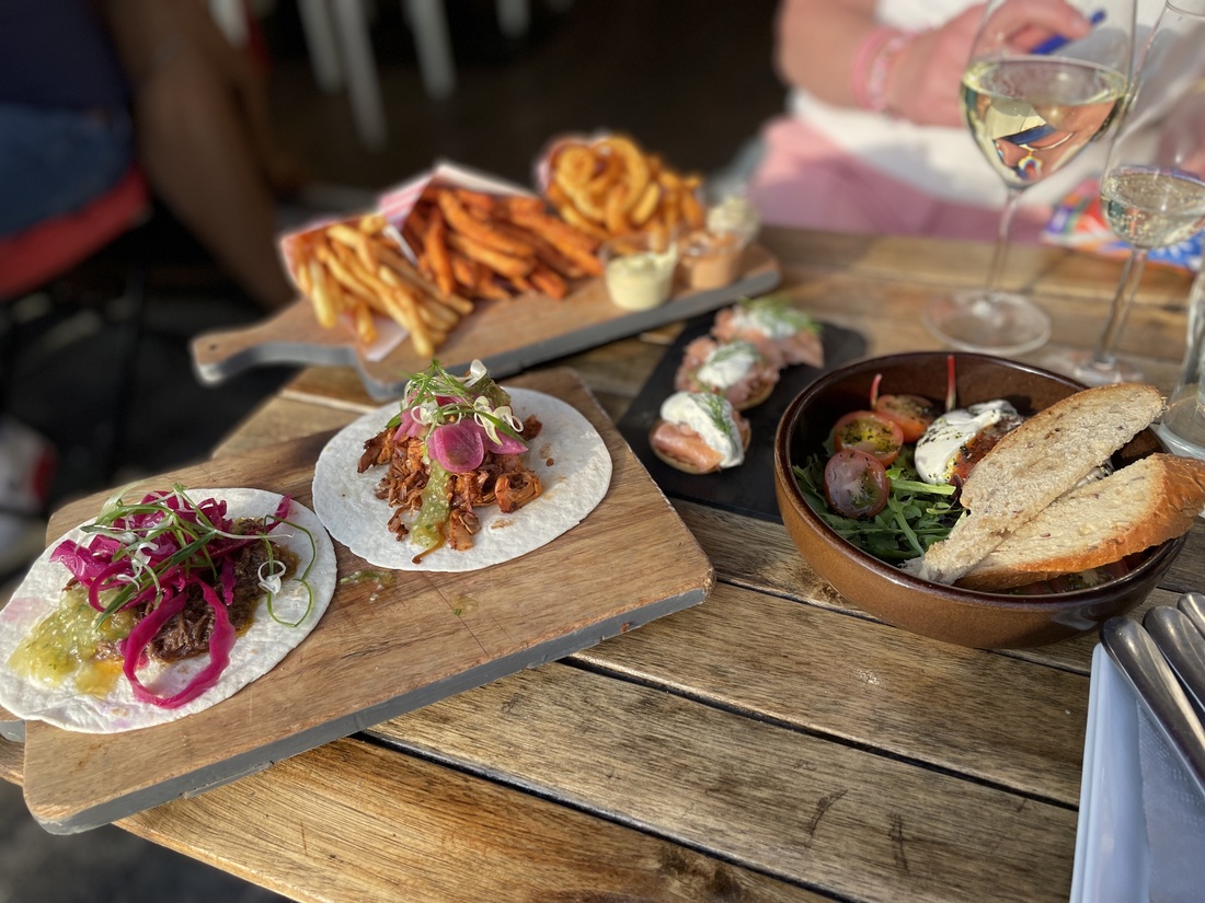 Nog voor de glazen leeg zijn wordt een plank met drie soorten friet met bijpassende mayonaises, blini’s met gerookte zalm, burrata met tomatenjam en toast en soft taco’s met pulled jackfruit en met barbacoa op ons tafeltje gezet. Een frisse gruner veltliner met verfijnde zuren complimenteert de gerechtjes.