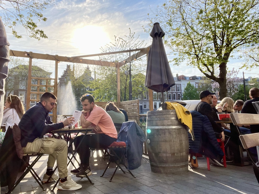 Het uitzicht is stedelijk, de tram zoeft voorbij, het is druk met fietsers en auto’s, maar op de achtergrond zorgt het geluid van de fontein in de Westersingel voor een ontspannen bijdrage. Al met al ervaren wij een echt stadsgevoel.