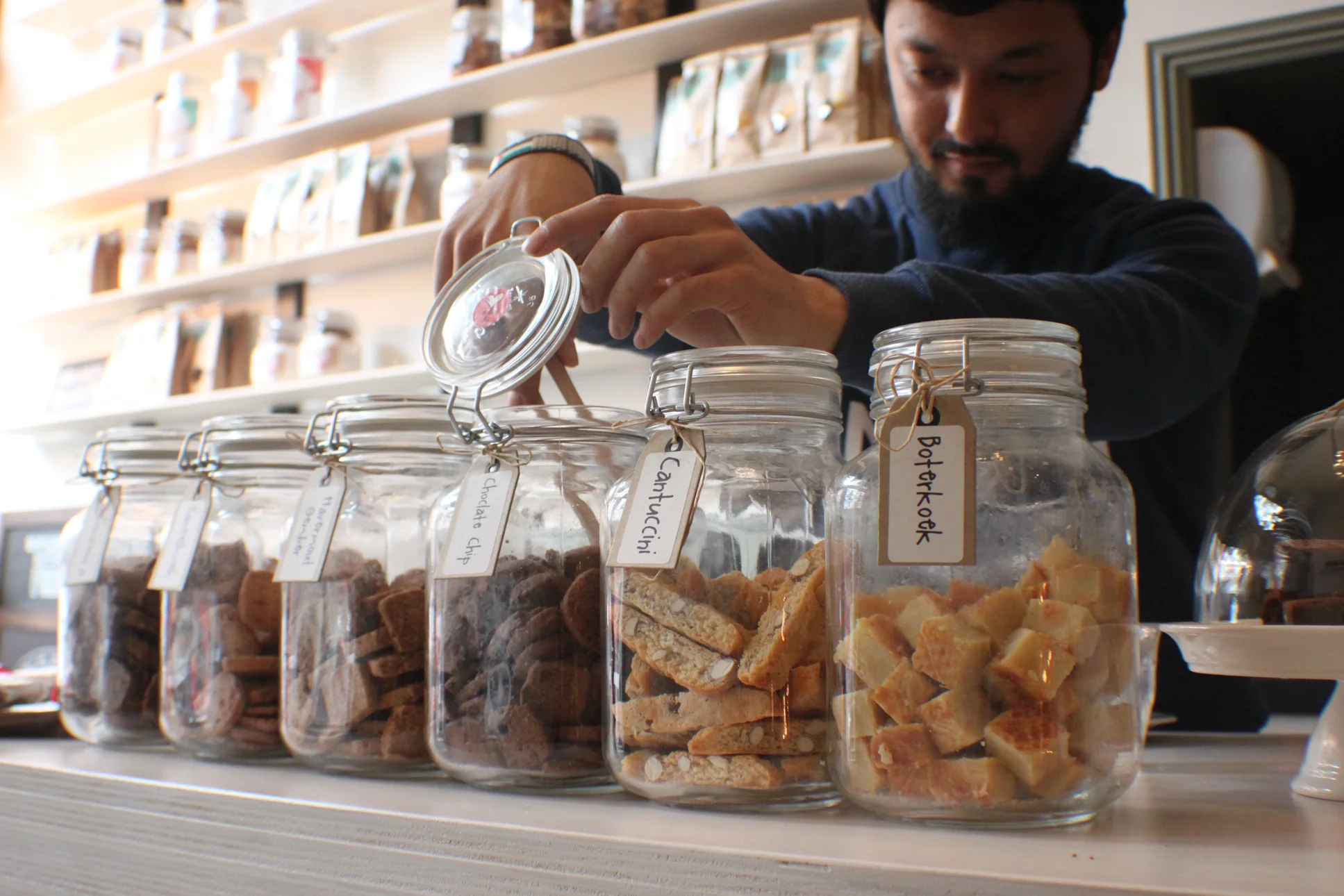 De koekfabriek is een koek-winkel waar je ook kunt plaatsnemen voor een lekkere kop koffie van de barista.