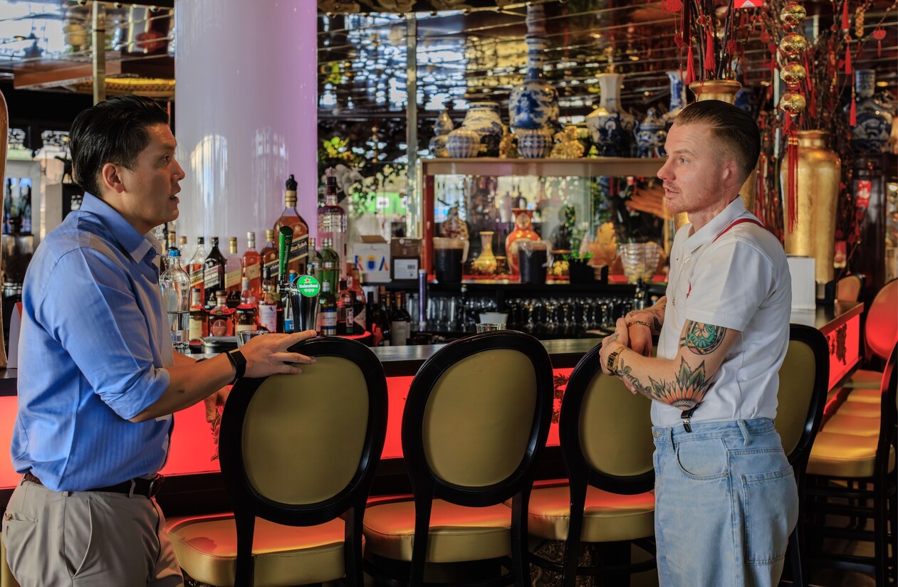 Timo begint over Sea Palace: “Dat is een instituut! En onderdeel van de skyline van Amsterdam. Vorig jaar hebben we ons personeelsfeest nog bij ze gevierd, een hele happening was dat. Ik heb zoveel respect voor mensen zoals jij, die dit soort iconische zaken levend weten te houden.” Kaji reageert: “Wist je dat wij een van de oudste drijvende Chinese restaurants ter wereld zijn? Toen mijn vader veertig jaar geleden het restaurant begon, haalde hij inspiratie uit dit soort boten die in de haven van Hongkong lagen. Die zijn inmiddels allemaal naar de bodem van de zee gezonken, maar wij zijn er nog steeds. Je kunt het je nu bijna niet meer voorstellen nu de stad zo opgeknapt is, maar in de jaren ’80 was dit absoluut geen a-locatie. Er werd voor de deur gedeald en getippeld, niemand kwam hier voor z’n lol. De gemeente was dus wel blij met de plannen van mijn vader en zijn compagnons. Ik denk niet dat zo’n project in deze tijd nog goedgekeurd zou worden.”