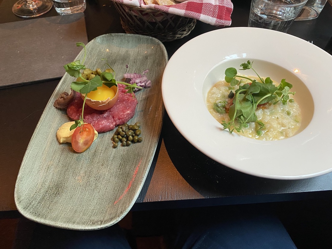 Wij genieten van de steak tartare, de risotto met asperges en de kroketjes. Stuk voor stuk smakelijke gerechten die met zorg zijn bereid en waarin de Franse klassieke keuken duidelijk doorklinkt. De bediening is vlot en vriendelijk.