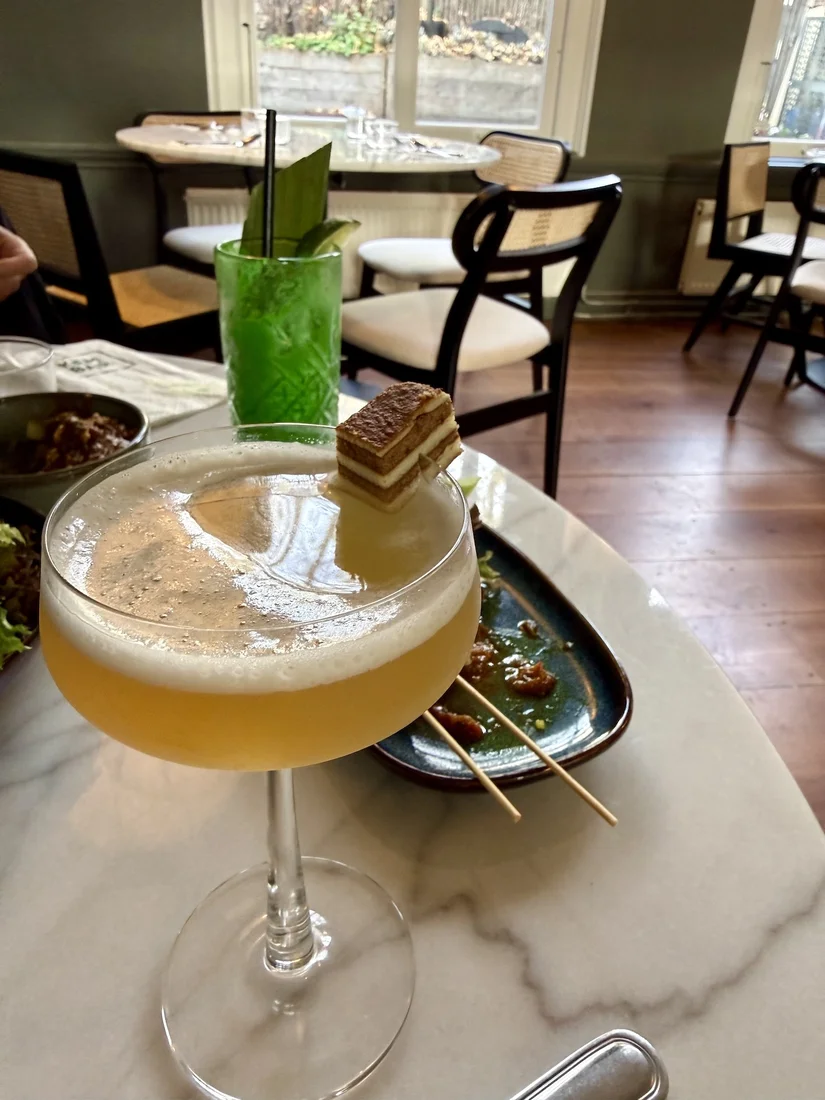 Eén of eigenlijk twee van de leukste nulpunt-nulletjes dronken we bij de Indonesische bistro Kembar: Pear & Spekkoek Martini, met een ieniemienie spekkoekje op de rand van een coupe, en Pornstar Martini, maar dan zonder Martini.