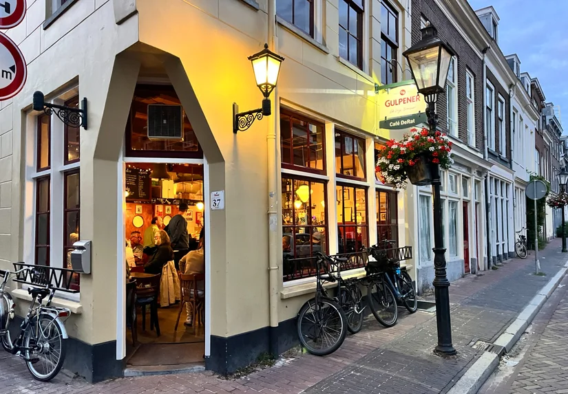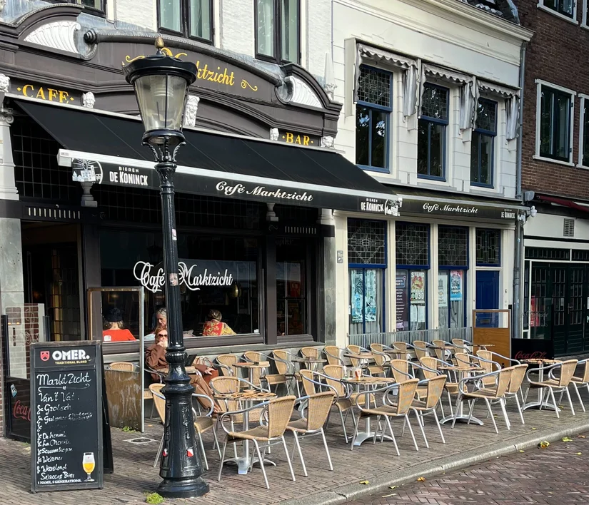 Voor een borrel (met of zonder plank), potje schaken of een goed gesprek ga je naar Marktzicht (anno 1898) aan de Breedstraat. Sinds 2025 kun je er lunchen én dineren in bruine sferen. Pluspunt: het zonnige terras waar je altijd wel een bekende voorbij ziet lopen. Elke zaterdagmorgen vindt in de straat de grootste stoffen- alias lapjesmarkt van Nederland plaats: goed moment om een bakkie te doen en een tosti te eten.