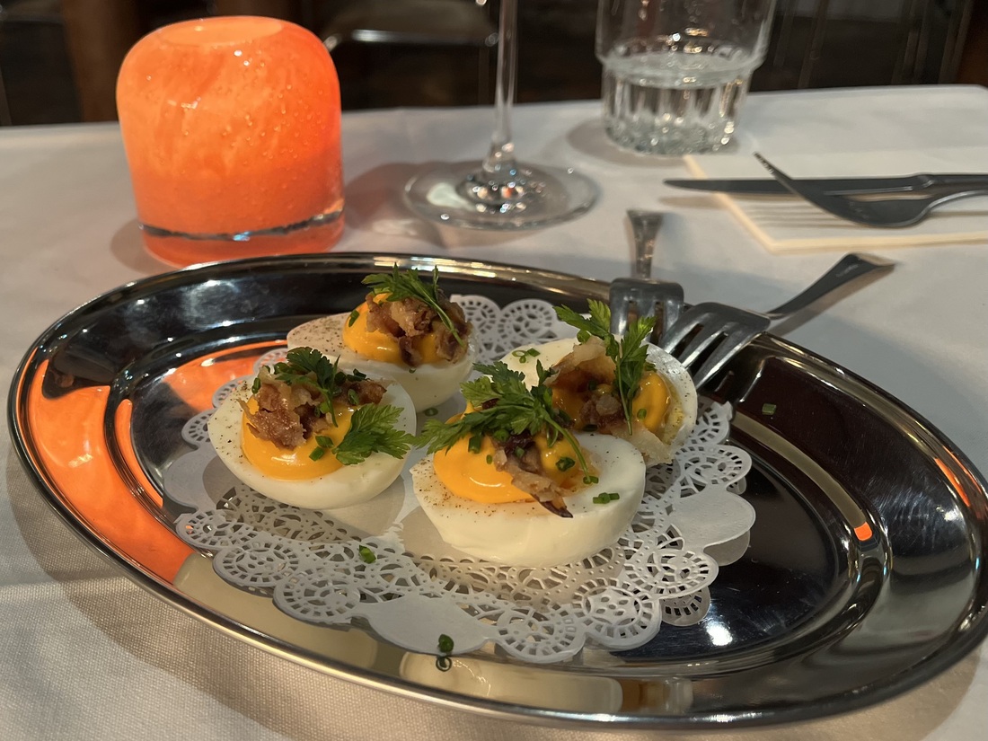 Dat het gerecht meer is dan een paar hardgekookte eieren, bedolven onder lobbige mayonaise, bewijzen ook Bistro Madeleine, die het gerechtje zo nu en dan op of buiten de kaart om heeft, en het kleine zusje Sea Salt Saloon waar eitjes en mayonaise worden opgewaardeerd met gedroogde ansjovis en limoen.
