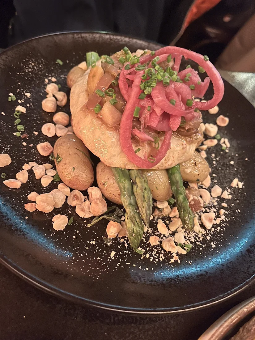 Omdat we de vroege film hebben, bestellen we allebei één hoofdgerecht en één portie nachos voor een zoon die komt aanwaaien. De daghap is een wat knoestige plak knolselderij op krieltjes en groene asperges. Erop: een lekkere hoeveelheid uienrelish die het geheel smaak geeft. Ernaast: grof gehakte en grof geserveerde hazelnoten.