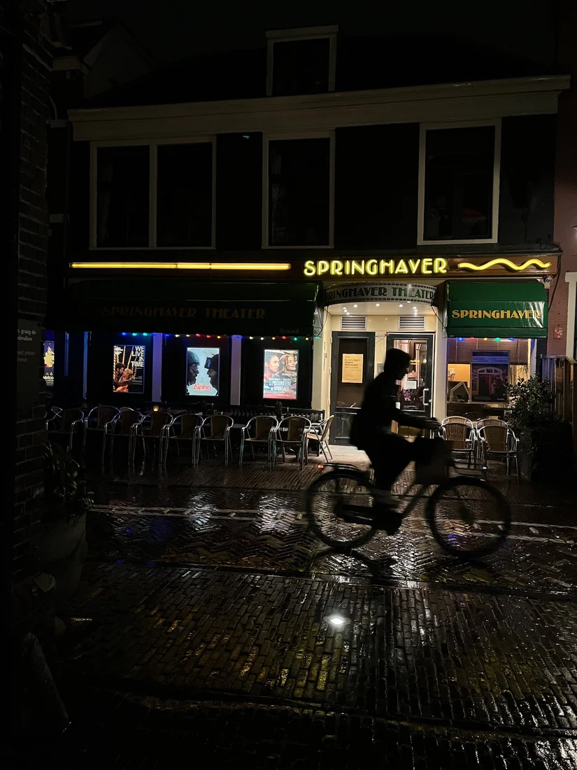 Habitués nemen dat voor lief, in de wetenschap dat ze kunnen doorschuiven als er iemand verderop in de pijpenla de kuierlatten neemt – of naar een voorstelling gaat. Het is een va-e- vient in Springhaver. De een komt voor bier met bitterballen of een glas huisgemaakte Glühwein, de ander doet zoals wij en plakt er ook een à la carte-gerecht en vegetarische daghap (die is erg goed weten we uit ervaring) aan vast. Daarna gaan we lekker bij de film uitbuiken.