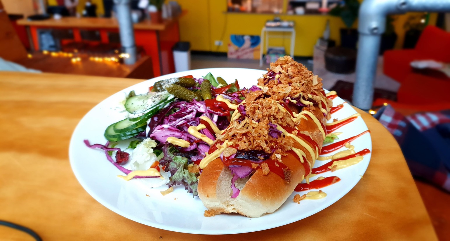 We kunnen kiezen uit een handvol lunchgerechten, zoals het klassieke twaalf-uurtje, vega(n) kroketten en soep. Wij gaan uiteraard voor iets kenmerkends van Café Keet. Alles is zoveel mogelijk vegetarisch, zo ook de hotdog. Tegenwoordig doet een vegetarische hotdog niet meer onder voor de vleesvariant. Wij krijgen hem zoals we hem willen; gebakken uitjes, mosterd, ketchup en knapperige rode kool op een langwerpige brioche. Lekker verantwoord comfortfood geserveerd met een frisse salade ernaast.