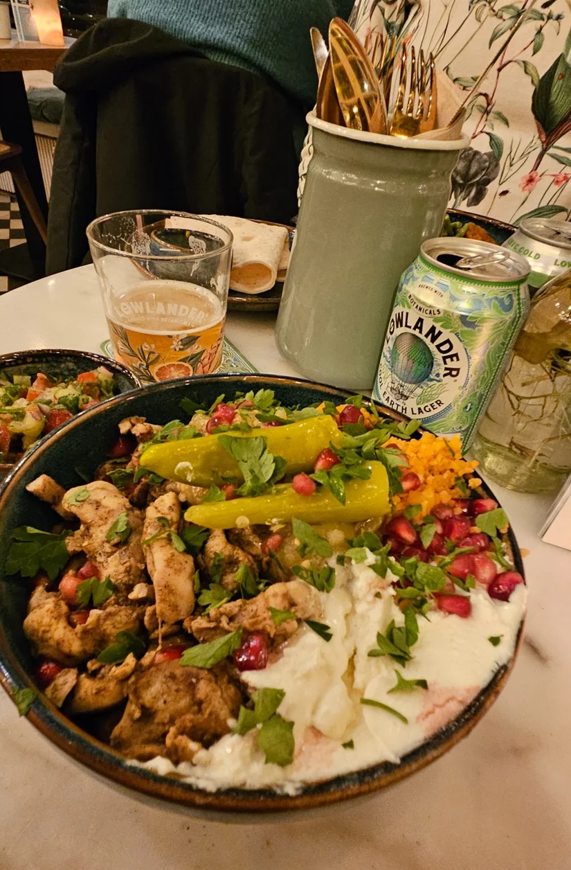 Wij kiezen de Chicken Shawarma Bowl en de Roti (allebei €18,50), maar dan in de glutenvrije variant, omdat mijn tafelgenote helaas glutenintolerant is (coeliakie).