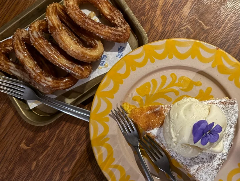 De churros zijn goudbruin en lekker dun en knapperig. De tarta de Santiago is een zalige amandeltaart die heerlijk bros is. Dat er Spaanse koks in de keuken staan (hebben we even nagevraagd), dat proef je. Knap gedaan van de Nieuwe Garde Horeca Groep, ook eigenaar van een Italiaanse osteria, wine- en seafoodbar en Franse bistro in Utrecht.