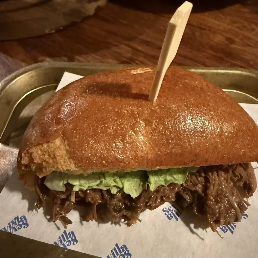 Eerst in dunne plakjes gesneden pollo, ofwel smoked kippendij van de BBQ met mojo verde en aardappeltjes en een bordje patatas bravas met een saus die meer uitgesproken had mogen zijn. Maar dan de hamburgers de rabo de toro: een mini hamburger van ossenstaart met saffraanmayonaise en little gem. De laatste is een winnaar: zelden zo’n lekker smeuïge hamburger gegeten.