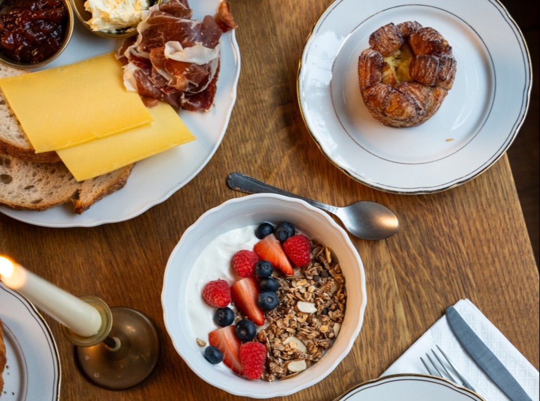 Het menu kent een ruim aanbod aan gerechten en zorgvuldig uitgezochte wijnen. Hoewel er, in lijn met de Franse keuken, overwegend vlees, vis en zuivel worden gebruikt, staan er ook een aantal vegetarische en, bij het ontbijt, ook veganistische gerechten op de kaart.