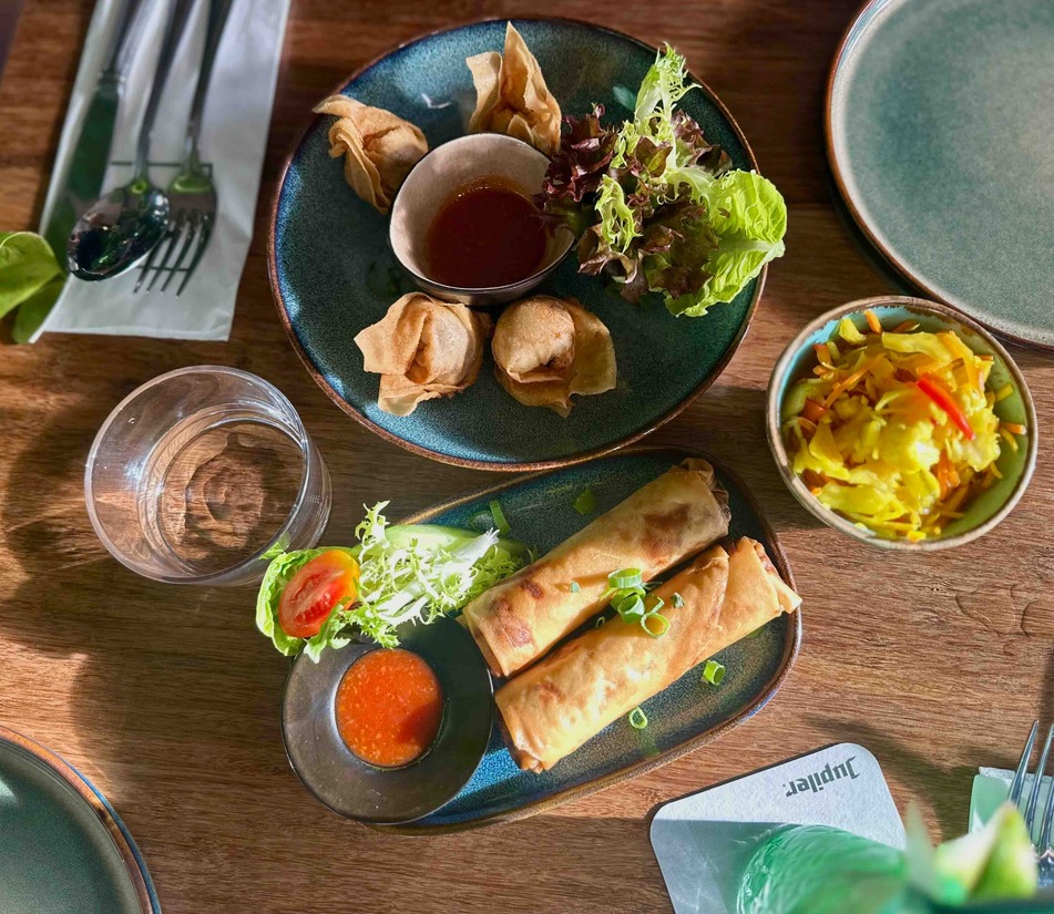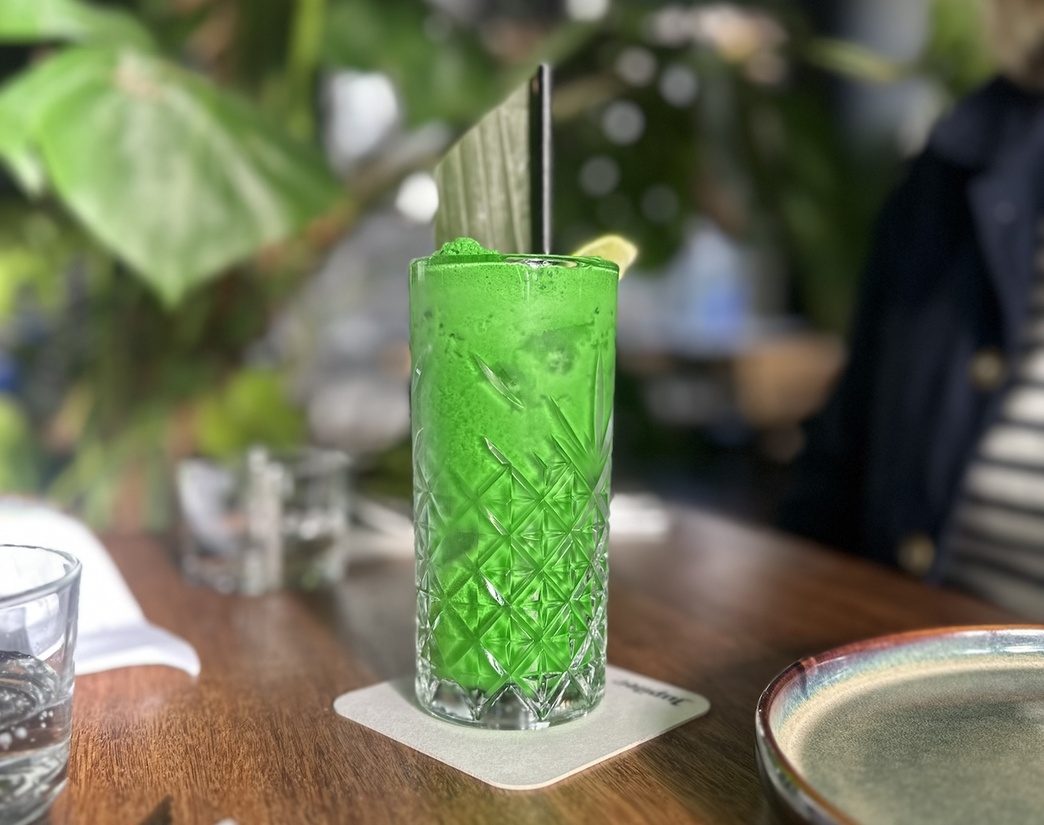 Dat willen we proeven! Bij binnenkomst slaan we niet rechtsaf, de cocktailbar in, maar gaan links, naar het restaurant. Door de herfstzon die binnen schijnt en de enorme plant naast ons tafeltje wanen we ons in een warm land als Indonesië, zeker door de mocktails. Voor de één is er een Kermit de kikker-groene Pandan Colada met kokos, pandan en limoen.
