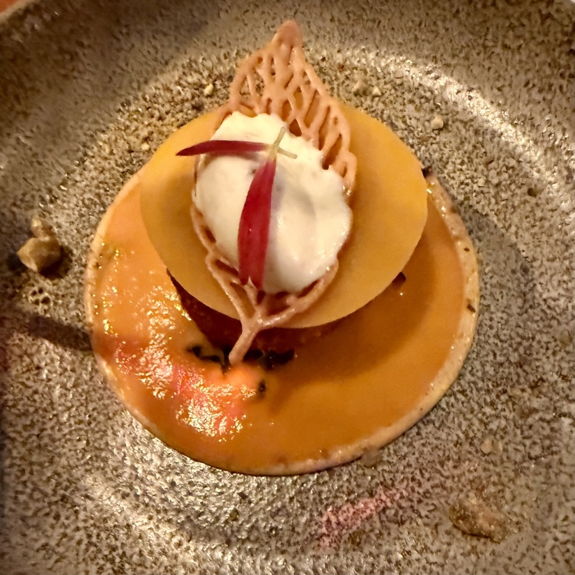 Als er één gerecht is dat je hier gegeten moet hebben, dan is het de signature dish van Concours. Deze week is de beignet gemaakt van gerookte maïs. Erop ligt, heel klassiek, een tuile en eronder yoghurtmousse met Oost-Indische kers, kefir en geroosterde amandelcrème met aji amarillo.