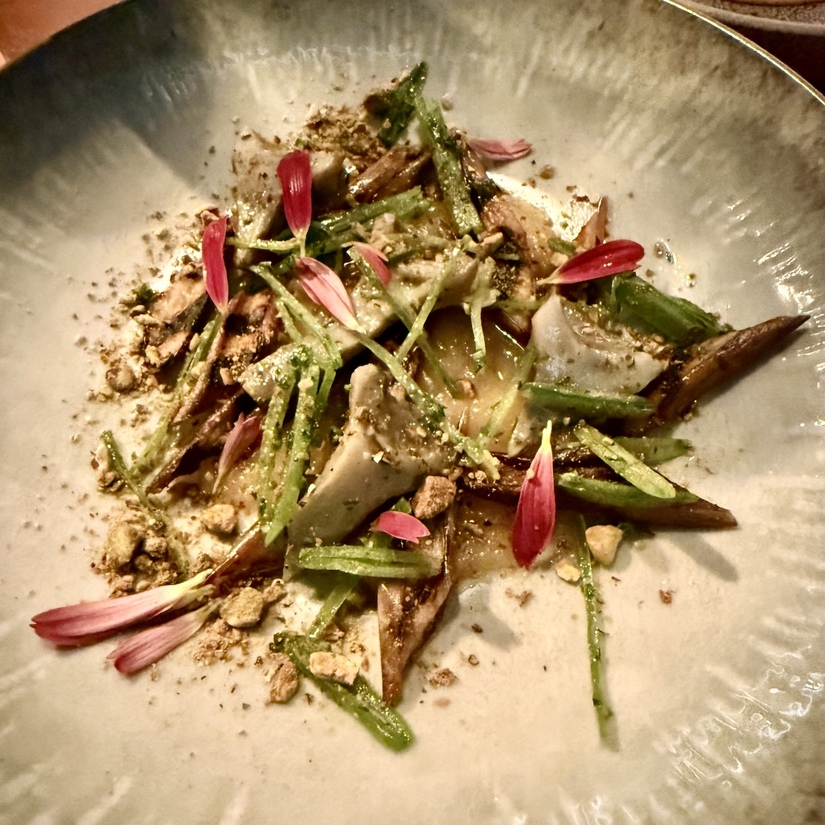 Attent en vriendelijk, zonder gedienstig te zijn. Wat een weldaad om te worden bediend door iemand met kennis van zaken die tegelijk relaxt is. Bij een glas crémant komt een bolletje van zuurdesembakker Menno ’t Hoen uit IJsselstein met beurre noisette. Een fijne binnenkomer, net als de amuses: mini-brioche met zoetzure meiknol en crème cru en een eenhapsgerechtje met bleekselderij, pittige pompoen en een chipje van zeewier.