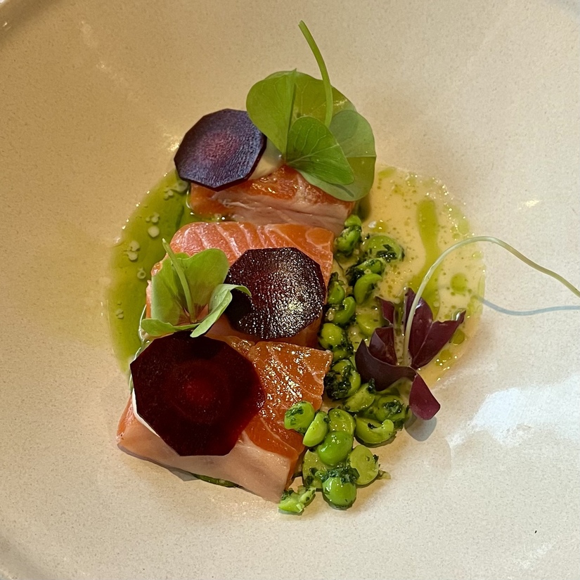 Het voorgerecht is zalmforel met arbeidsintensieve - want dubbelgedopte - doperwtjes en klaverzuring. Vanuit een sauspannetje wordt beurre blanc met mierikswortel geschonken. Heel puur, heel zuiver, net als de wijn van grüner veltliner en weissburgunder van Weingut Weidinger.