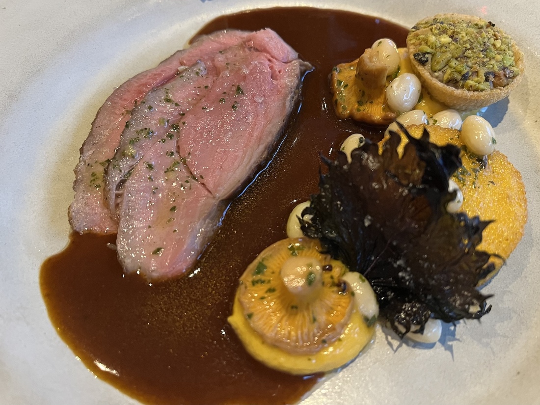 Dat geldt ook voor het hoofdgerecht: twee plakken lamsbout met polenta, borlottibonen, crème van kalfszwezerik en relish van augurk. Erover komt een soort BBQ-saus, een fantastische jus van geroosterde jonge prei. Gelukkig blijft het kannetje staan, net als het brood dat (applaus) op tafel is gebleven. Dat Concours nog échte sauzen maakt, lekker slow getrokken, proef je aan alles.