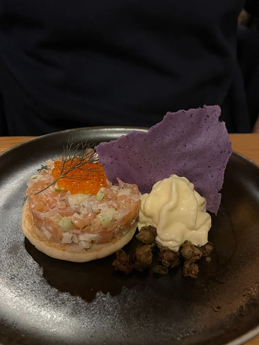 Daarna delen we twee voorgerechten: tartaar van gravad lax (zalm) met een frisse en luchtige crème fraîche-sabayon, gereserveerd op een blini en gegarneerd met forelkuit én een flinterdunne tartelette met aardpeercompôte en pecannoten, krullen van tête de moine (kaas) en zwarte knoflookcrème.