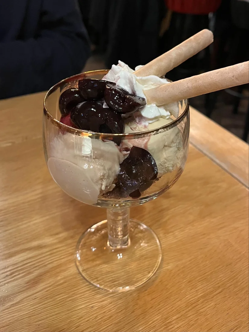 Misschien komt het omdat we te veel desembrood hebben gegeten (en bier hebben gedronken), maar voor een dessert hebben we eigenlijk geen plek. Omdat we ontzettend benieuwd zijn naar het huisgemaakte bierijs besluiten we één coupe te delen.