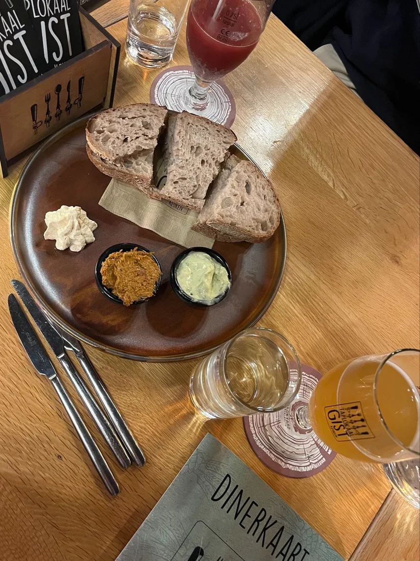 We starten met huisgebrouwen witbier en een sour smoothie bier van brouwerij Elmeleven. Naast witbier schenkt Gist nog drie andere huisgebrouwen bieren: een blond, dubbel en Hazy IPA. We eten er desembrood bij met een trio van huisgemaakte gistboter, tapenade en vegan-aioli met groene kruiden. De boter is een eerste subtiele aanwijzing dat bier niet alleen in het glas, maar ook terugkomt in gerechten.