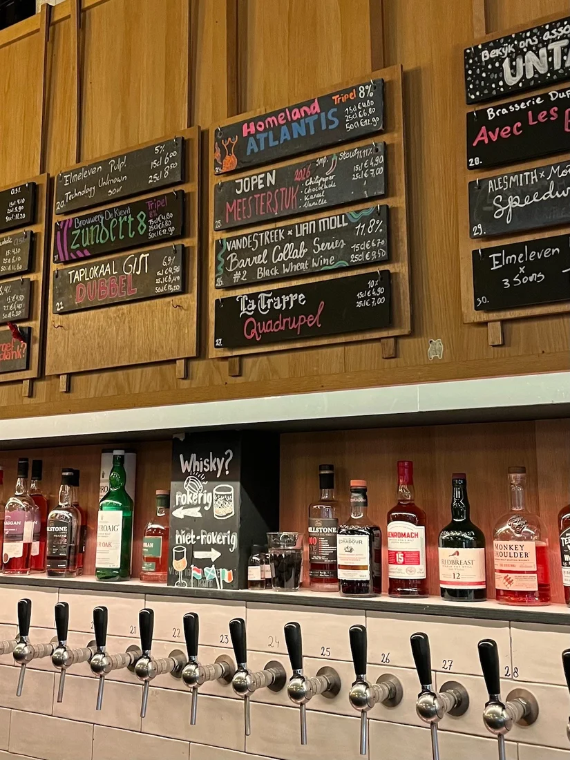 Bij binnenkomst wordt direct onze aandacht getrokken door de muur met dertig wisseltaps voor de speciaalbieren die worden geschonken. Erboven: kleurrijke krijtborden met tekst en uitleg. Opvallend zijn ook de Jugendstil-achtige lampen die op verschillende plekken terugkomen in het taplokaal.