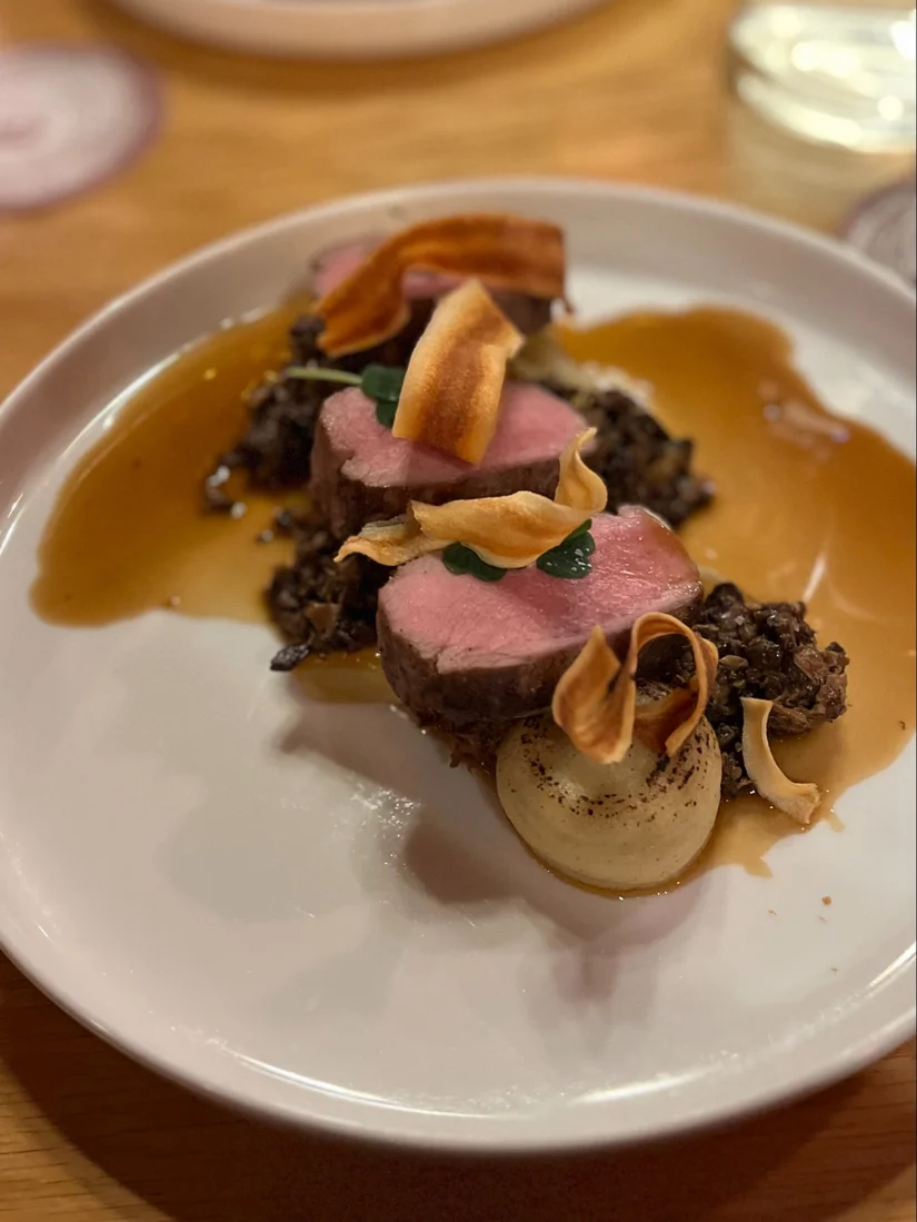 Het hoofdgerecht, wildzwijnfilet en -stoof, wordt geserveerd met een jus van knolselderij, gebrande aardappelpuree en schorseneren. Wat ons betreft is dit het lekkerste gerecht van deze avond.