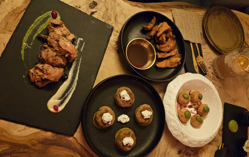 We beginnen met yoghurt kebab die er op het eerste gezicht uitziet als een licht krokante bitterbal. Zodra je ‘m open bijt, merk je echter dat de vulling niet bestaat uit ragout, maar uit een stevige, romige, bijna kazige yoghurt. De cranberry bovenop zorgt voor een frisse tegenhanger.