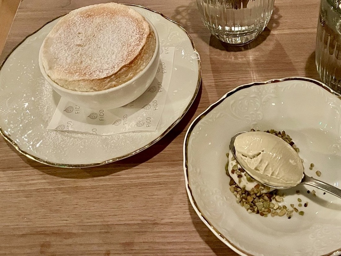 Daarvan moeten we even bijkomen en dat kan ook: de bereiding van de soufflé (‘Met twee lepeltjes graag’) duurt twintig minuten. Heerlijk om in zo’n viby tent zo’n klassiek dessert te kunnen eten. Dit ideale fluffy nagerecht komt op tafel met pistacheijs en gecrushte pistachenootjes en zorgt voor een waar oh la la-gevoel. De rekening valt bovendien mee. Met een vier gangen chefsmenu voor 59 euro en à la carte gerechten van 12 tot 32 euro (voor ossenhaas ‘stroganoff’) is de prijs-kwaliteitverhouding in Fico dik in orde.