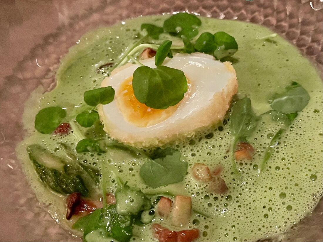 Ondertussen komt als tussengerecht – bij een glas Viognier - een krokant ei met schuim van waterkers, gebakken cantharellen en groene asperges. Een zalig vegetarisch gerecht, alleen iets te hoog op smaak (zout).