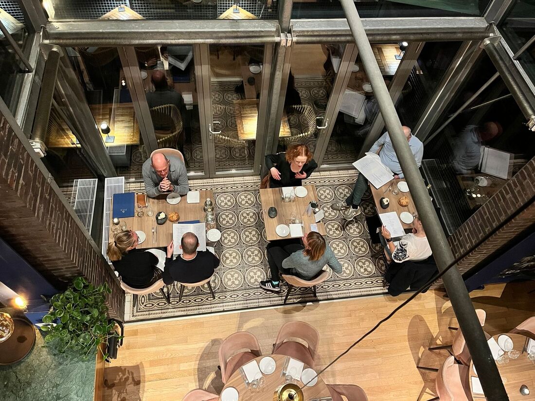 Het eerste dat opvalt zijn de glazen erkers in het half op de kade en half boven het water zwevende restaurant. Buiten miezert het, maar in de uitbouwtjes van deze voormalige havenloods zie je hoe gasten gezellig keuvelend aan tafel zitten. Wij blijken hetzelfde weidse uitzicht te hebben over de Veilinghaven, maar eerst moeten we twee steile trappen op. Goed voor de stofwisseling zullen we maar zeggen.