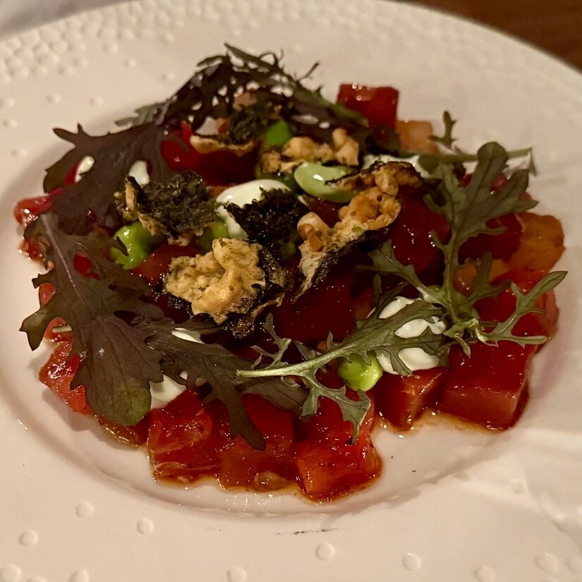 Minstens zo goed bedacht en uitgevoerd is de tonijn. Die is in kleine blokjes gesneden, gemarineerd in niet te zoute soja en wordt als een soort mozaïk opgediend met watermeloen en rettich in hetzelfde formaat.