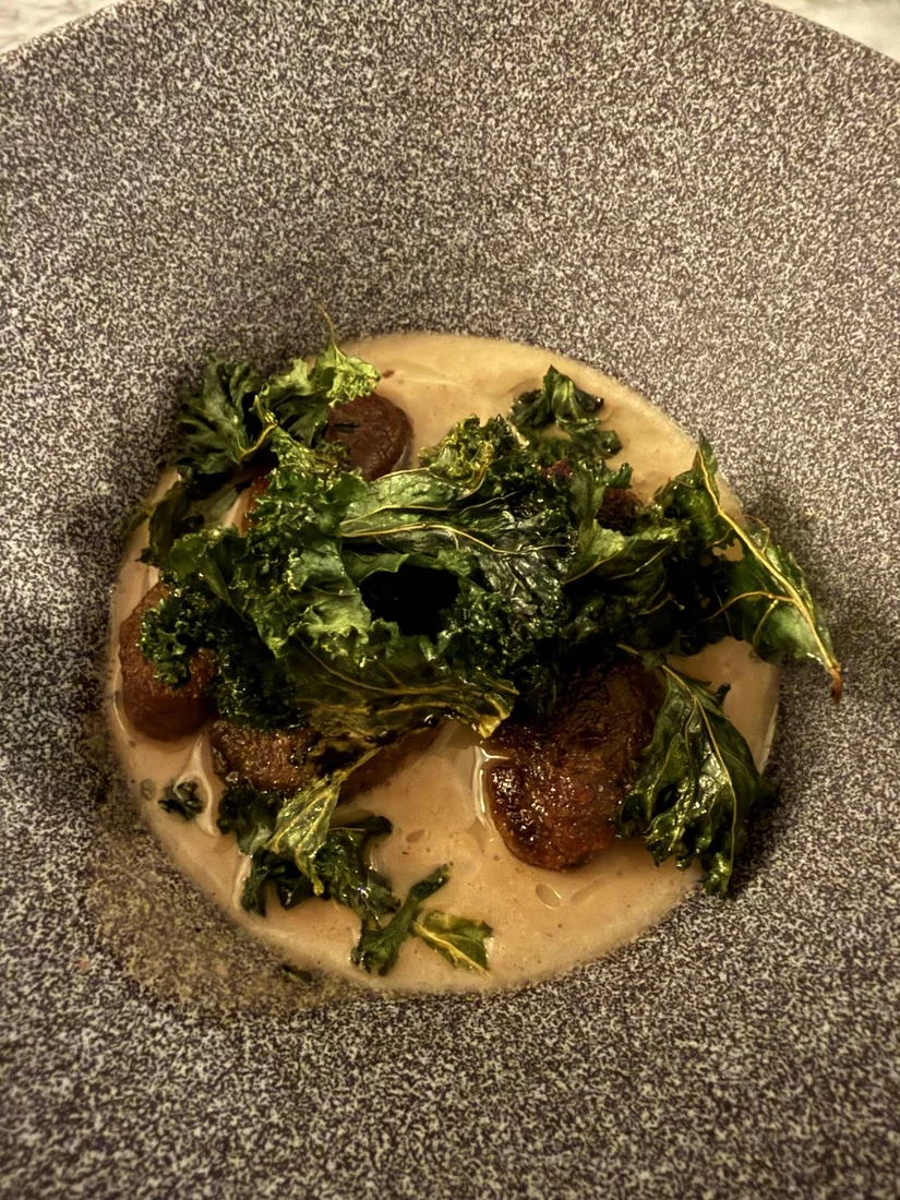 Na breed overleg wordt gekozen voor een minstens zo gedurfde lamsbal - in plakjes geserveerd met meiraap en tomatillo – die helaas een beetje flauw smaakt. De Romeinse gnocchi van griesmeel met saus van paddenstoelen en laurier en gefrituurde boerenkool is daarentegen één bak umami.