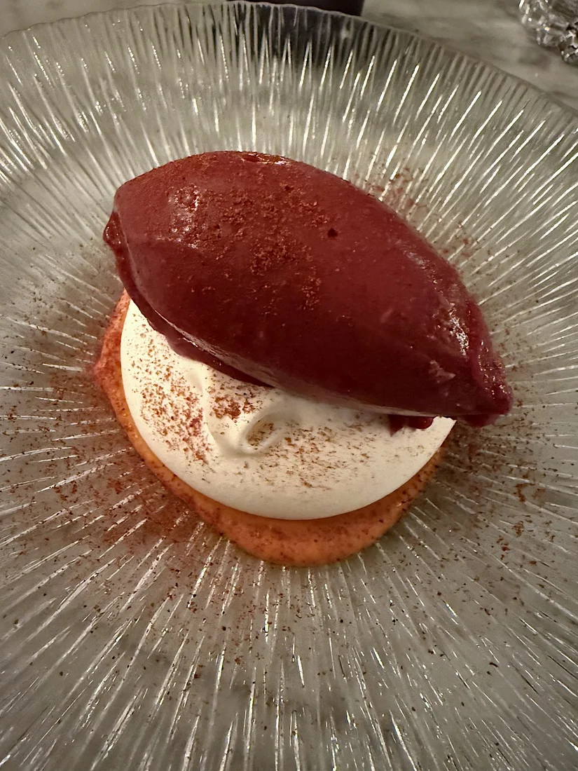 We zijn toe aan het dessert en delen met z’n vieren cucurbita (pompoen) met chichorei, custard, Japanse kwee en gember, een soort heavy Marsreep, en een vederlichte terrine van kweepeer met koji en lak van mirabellen. Allebei verrassend, allebei lekker.